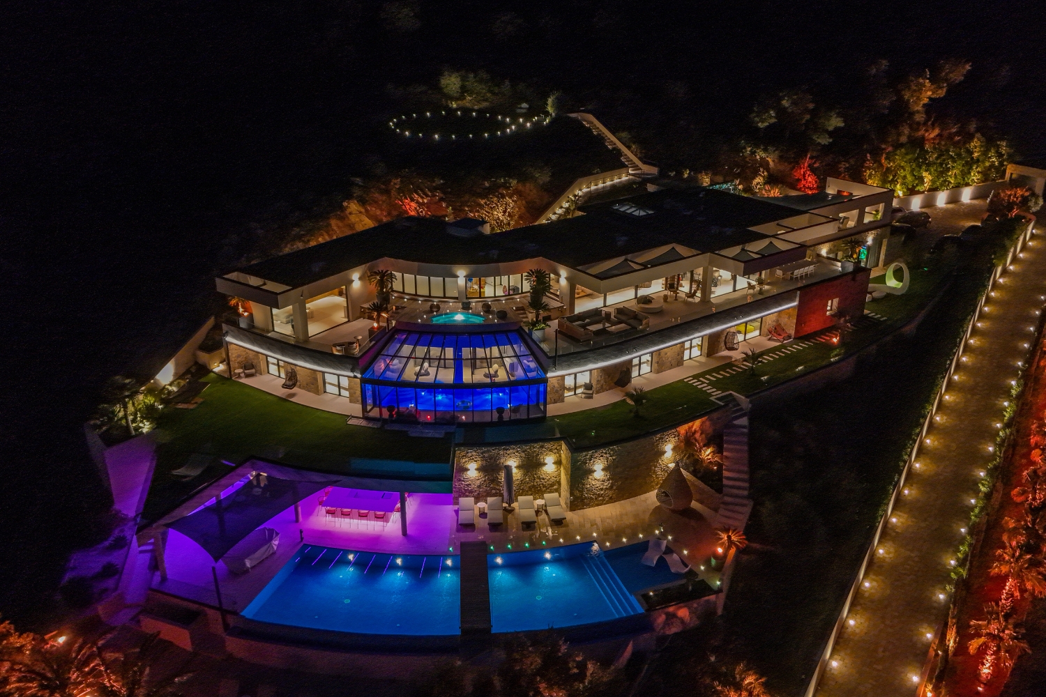 For wellness enthusiasts, the villa unveils an unrivalled spa area: a hammam carved into the natural rock, a massage room, an indoor heated pool beneath a retractable glass roof, a serene tea lounge, and an outdoor jacuzzi. The sensory journey continues in the indoor gym, equipped by Technogym, where the view of the gulf transforms every workout into a moment of inspiration.