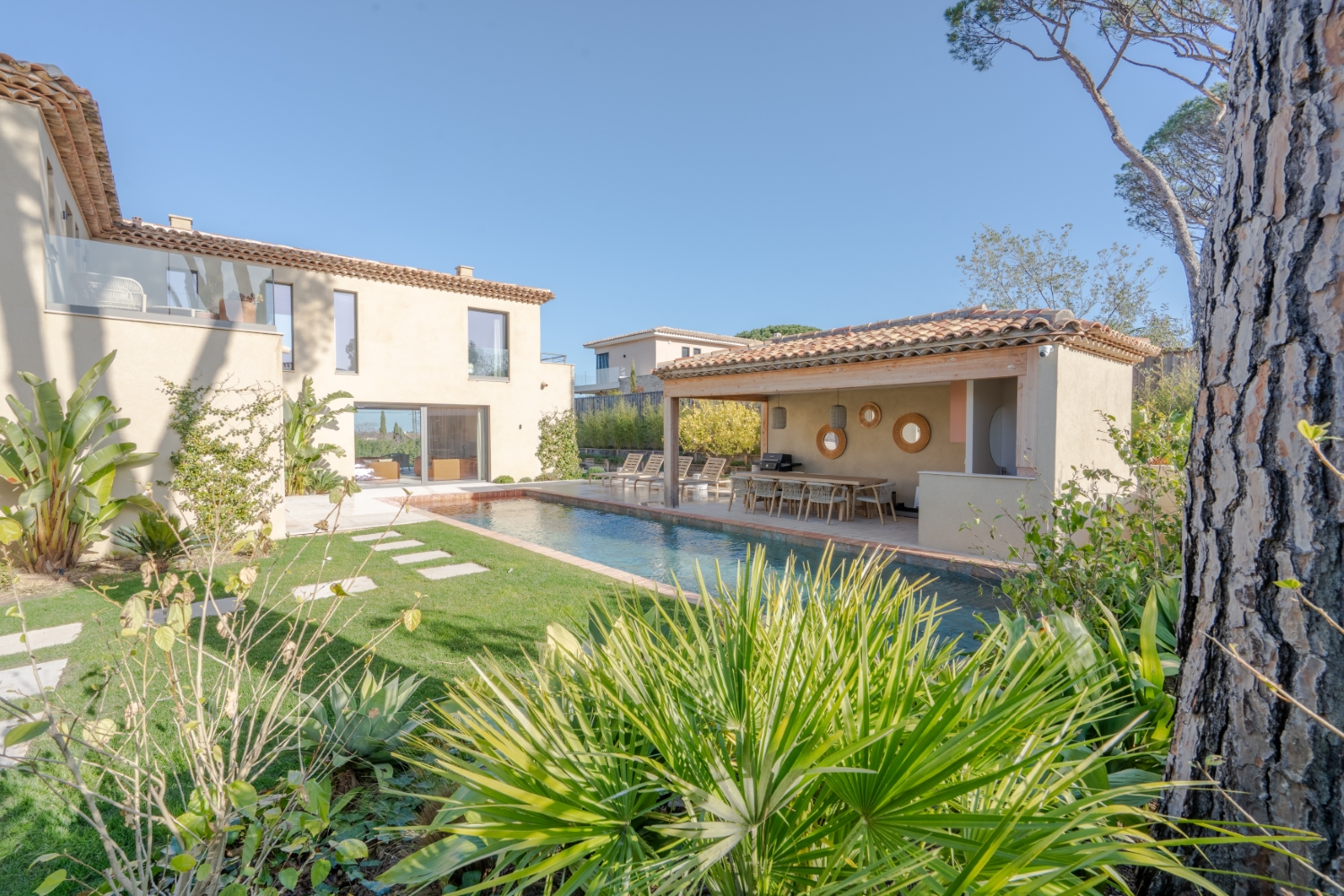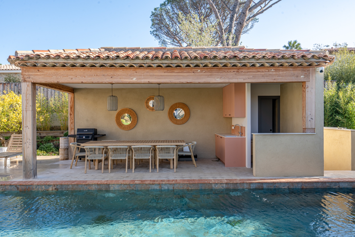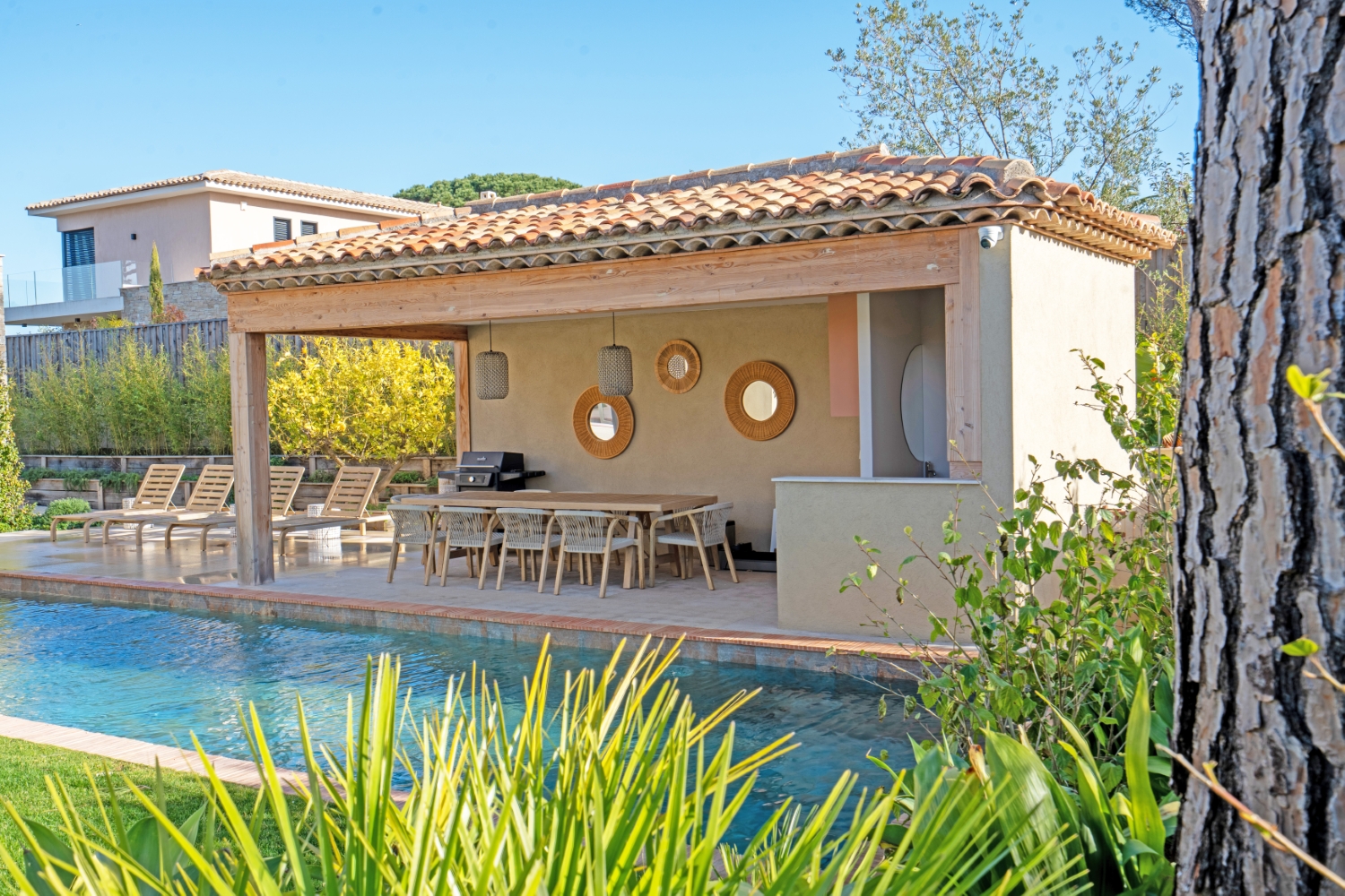 The exterior of the villa is equally impressive, inviting you to soak up the Côte d’Azur sunshine before heading off to the beaches of Pampelonne or the village of Saint-Tropez. Around the heated swimming pool, a pool house offers the ideal setting for relaxing after a swim. Here, grilled meats take pride in being served during lunches at the villa. At aperitif time, the petanque court becomes the stage for family laughter or competitions between friends. After enjoying the peaceful and cheerful atmosphere of your villa, you can head off to one of Saint-Tropez’s most popular restaurants or clubs to extend the night until dawn.